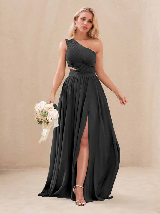 Eulalia Elegant One Shoulder Cutout Waist Slit Long Chiffon Bridesmaid Dresses