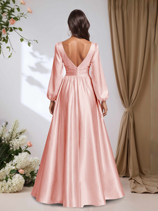 Caoimhe Modern V-Neck Slit Long Sleeves Floor Length Satin Formal Dresses