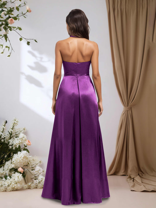 Dalora Chic Halter A-line Stretch Satin Bridesmaid Dresses With Slit