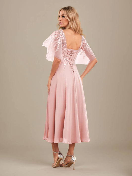 Davena Ethereal Lace Appliques Tea Length Chiffon Mother Of The Bride Dresses