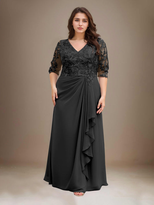 Evadne Sophisticated V Neck Lace Ruched Long Chiffon Mother of the Bride Dresses