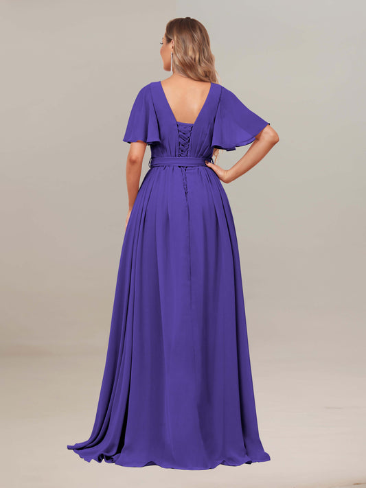 Damaris Charming Short Sleeves V-Neck Maxi Chiffon Bridesmaid Dresses