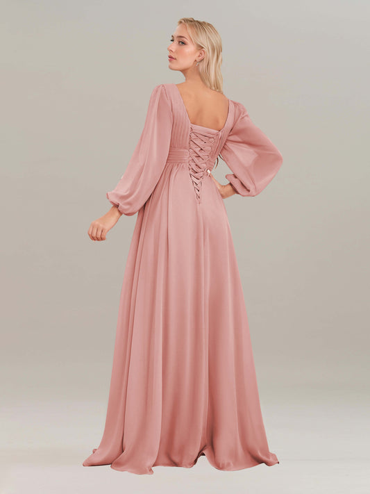 Cyrene Modest Long Sleeves Scoop Pleated Maxi Chiffon Bridesmaid Dresses