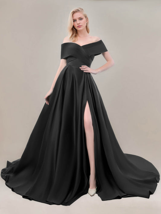 Euphrasie Lavish Off the Shoulder With Pockets Sweep Train Satin Occasion Dresses