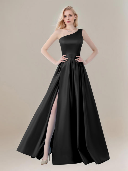 Galatea Luxe A Line One Shoulder With Pockets Slit Satin Formal Dresses