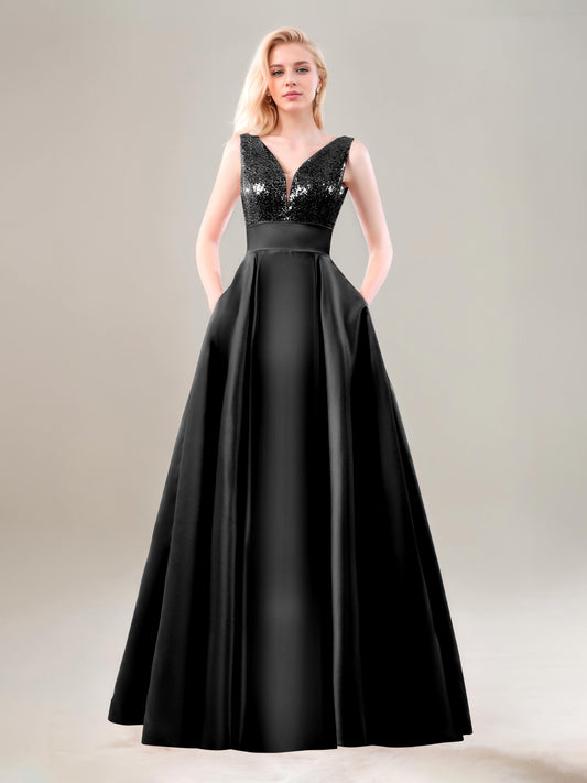 Gloriana Stunning V Neck Sequins Sleeveless A Line Long Satin Formal Dresses
