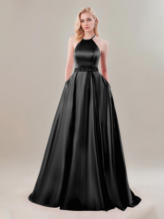 Golda Luxe Halter Neckline Sleeveless Belt Pockets Long Satin Formal Dresses
