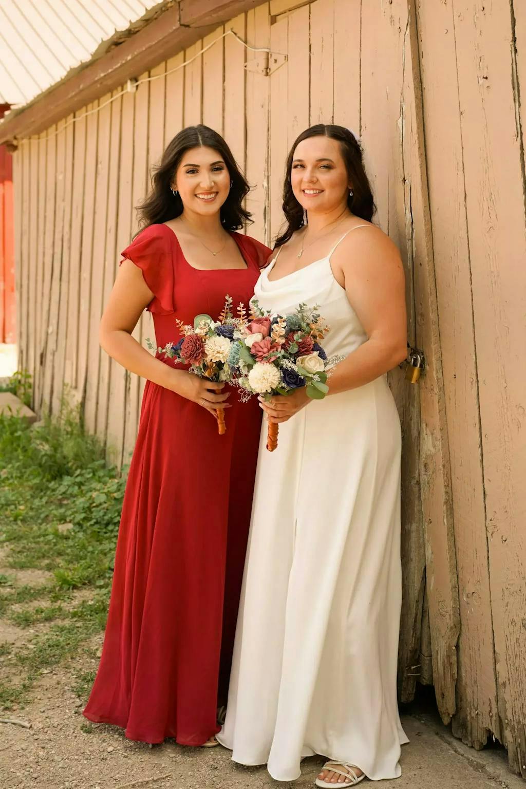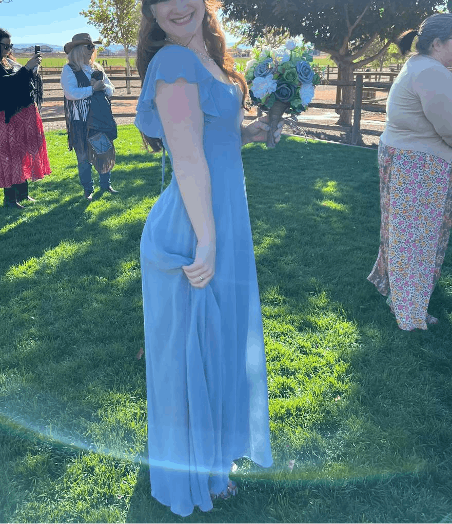 The blue dress is perfect for this wedding. I bought this dress to be a bridesmaid at my friend's wedding and loved it! I chose the custom measurements option and it turned out perfect.
