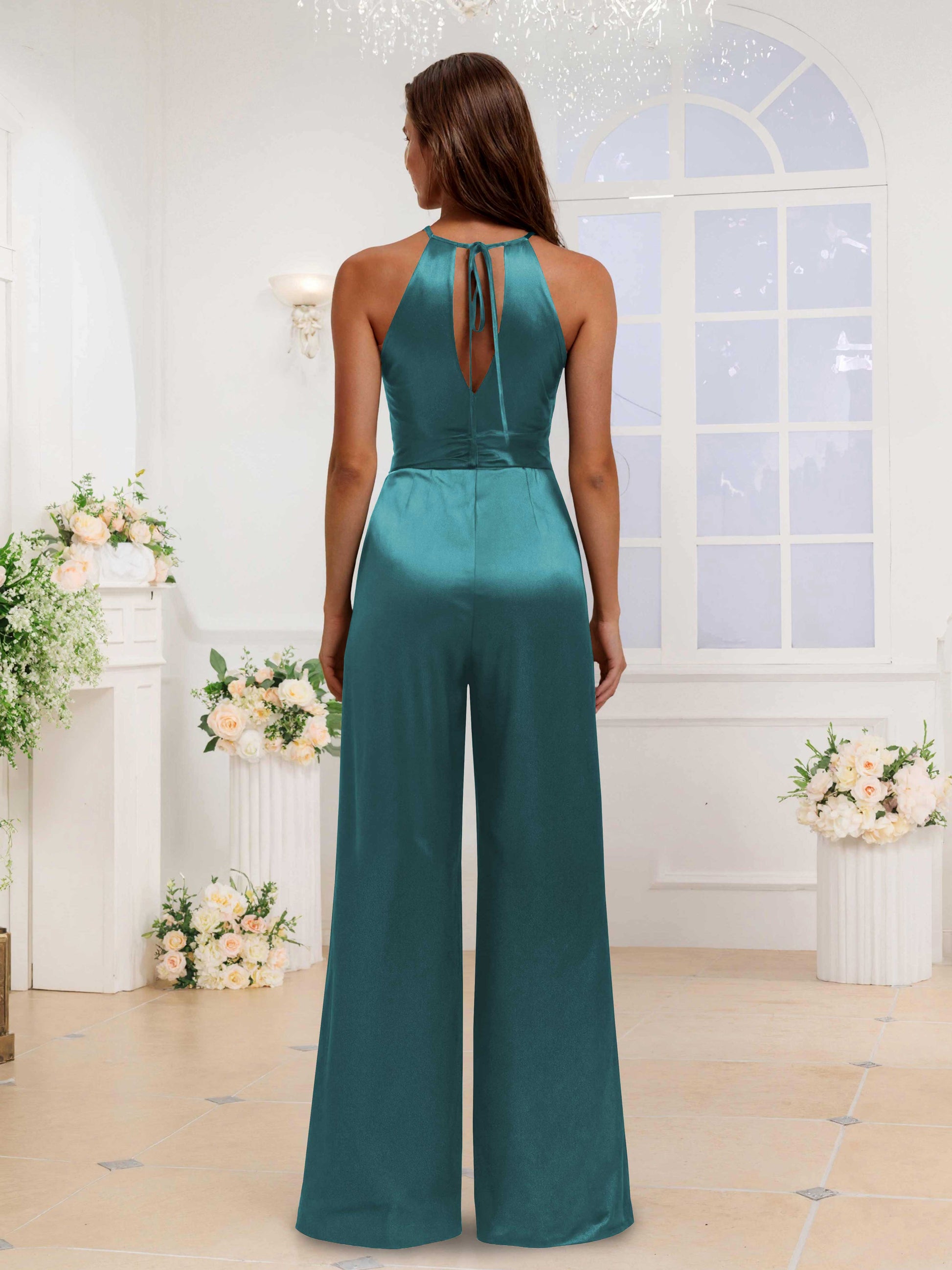 Elegant Halter Ruched Satin Jumpsuits For Bridesmaids With Pockets