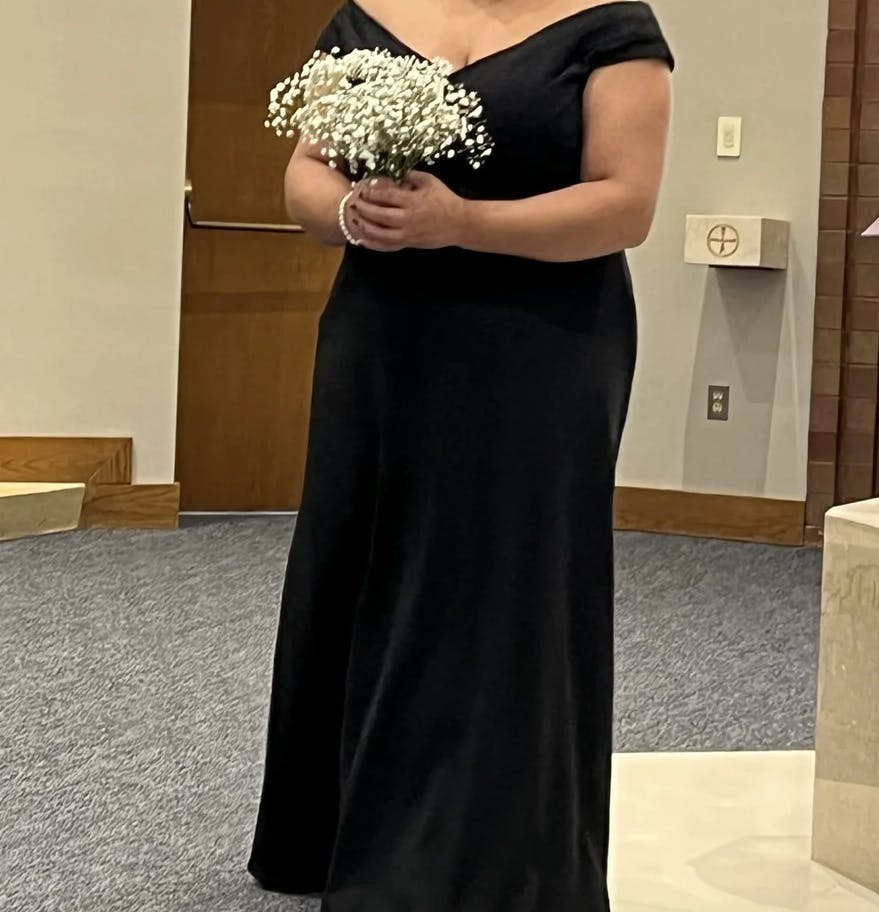 Very happy with this gown. The sleeveless V-neck style is flattering and elegant, and the A-line silhouette is forgiving yet stylish.