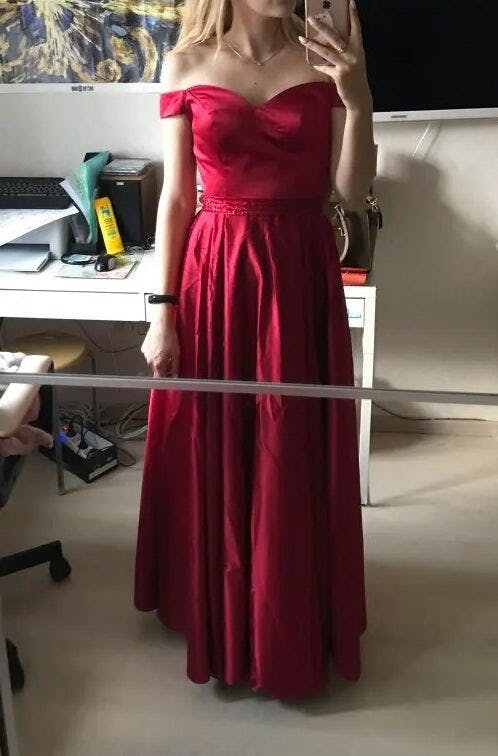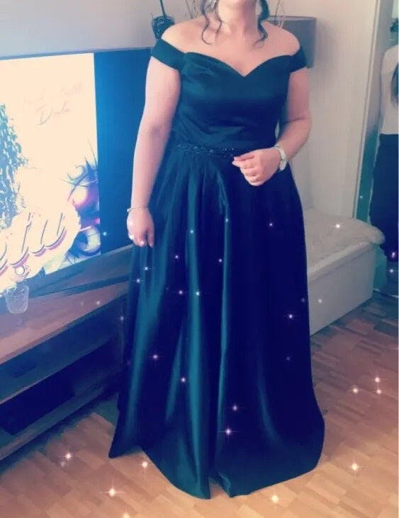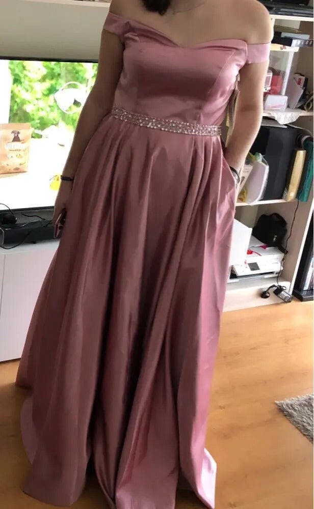 I wore this for my rehearsal dinner and it was everything I hoped for. The off-the-shoulder cut looked elegant without feeling restrictive, and the pockets were such a pleasant surprise. I kept my phone and lipstick in them all night. The satin catches the light beautifully, and honestly, it looks way more expensive than it is.