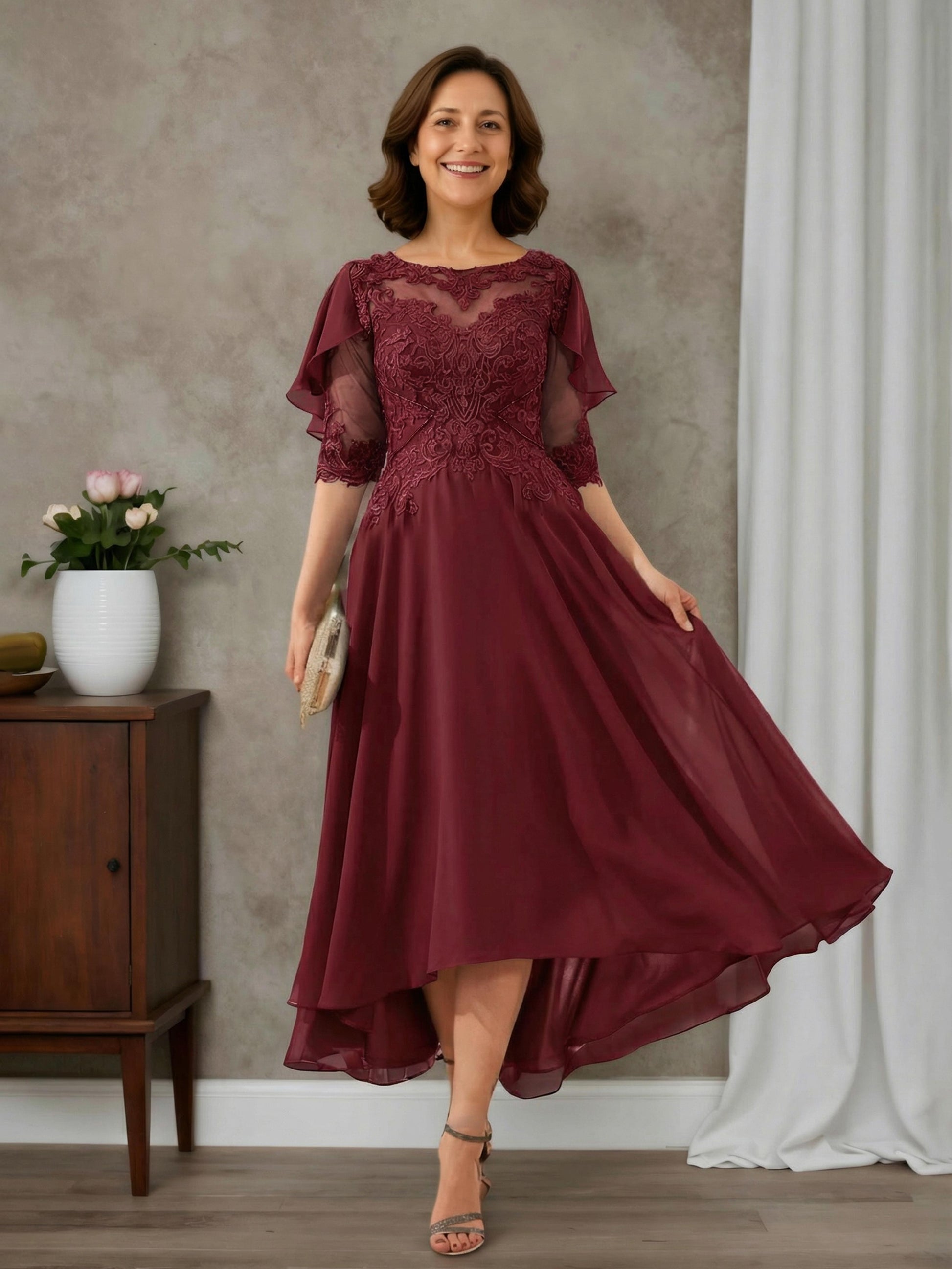 Solenne Elegant A-line Scoop Half Sleeves Asymmetrical Chiffon Mother of the Bride Dresses